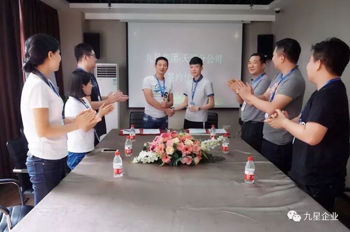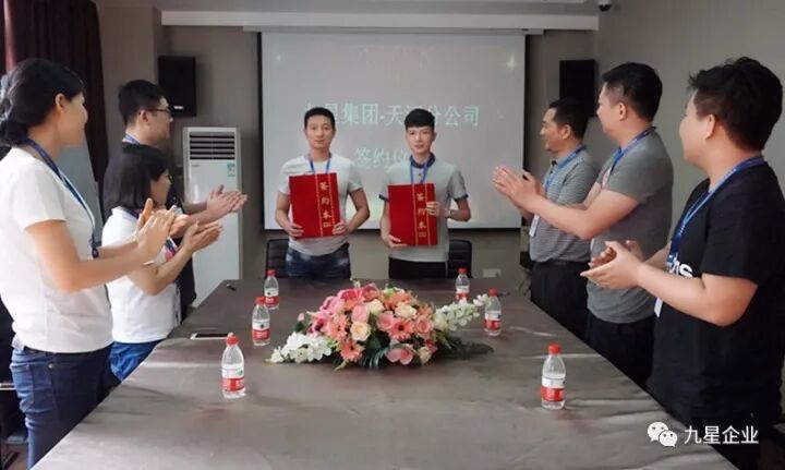 在九星诸位经理的见证下,九星企业彭东总经理与新晋分公司谢伟经理交换合约。